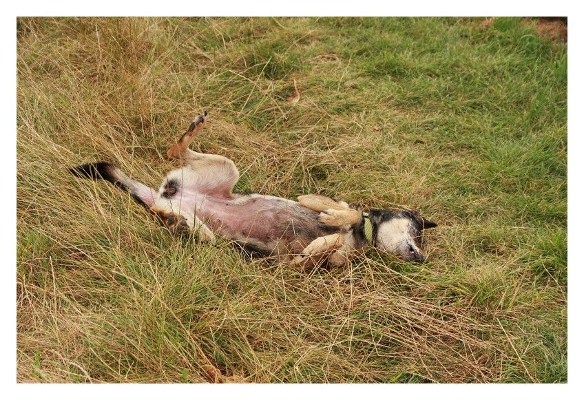 Heute haben wir gekämpft. Da war doch so eine doofe Kittykatze in unserem Garten und wollte Humpelchen fressen!!! Und dann wollte die auch noch nicht mal auf einen Baum, die Katze, nicht Humpelchen und wir alle vier sie unter die Hecke gejagt. Careto hat jetzt ein blutiges Ohr und Mama hat uns erst einmal alle in die Scheune geschickt, damit die Katze aus dem Garten verschwinden konnte und dann hat sie Careto versorgt. Unser alter Opa war toll ... war richtig im Jagdmodus. Jetzt hat einen kleinen Schnitt auf dem Ohr. Armes Männlein, meinte Mama und dann sagte sie, geschieht dir recht eine Katze zu jagen. Wir haben nur Humpelchen gerettet ... ok, die war hinterm Zaum im Auslauf, aber trotzdem. Pfft!!!!