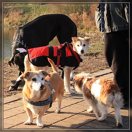 Mein Magen grummelt wieder und gerade heute, wo wir wieder als großes Rudel unterwegs sind. Aber ich war tapfer und bin mit gegangen. Zum Schluß hat mich Herrchen aber getragen, die Kälte, trotz meines Mantels, war viel zu viel für mich und meinen Grummelmagen. War aber gut, mal wieder Haro zu begrüßen und Chandini beim Rudelzusammenhalten zu zuschauen. Und Frauchen und Herrchen haben jetzt fotoknipst. Frauchens Bilder seht ihr hier. Ich bin nicht drauf, weil ich meist neben ihr stand und sie beraten habe, welches Motiv sie denn jetzt ablichten soll. Jawoll!!! Aber meinem Magen geht es wirklich nicht gut. Ich glaube mir ist so richtig schlecht.